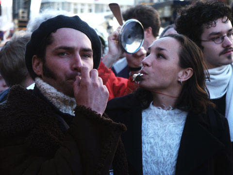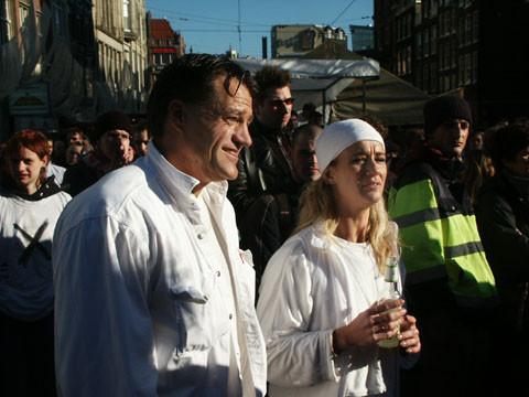 Witte Plein wil het Spui De enige groep demonstranten die zich tot nu toe heeft aangemeld voor het huwelijk, mag niet op de door hen gewenste locatie demonstreren. Comite Het Witte Plein wil graag op het Amsterdamse Spui 'de schaduwkant van de oranjegekte' belichten tijdens de tijtoer van Alexander en Maxima op 2 februari. de gemeente zegt het plein, dat aan de route ligt, nodig te hebben voor hulpdiensten, vrachtwagens met NOS-apparatuur en zwaaiend publiek. Volgens Witte plein-organisator Eelke heemskerk is al op 2 oktober een aanvraag voor de demonstratie ingediend, ver voor de route van de tour vast lag. "Deze week kregen we een brief van Cohen dat het Spui vol is", zegt Heemskerk. "De fout ligt bij de gemeente: wij zijn nooit betrokken bij welk overleg dan ook." het Comite bestaat uit verschillende groepen als H.I.J.O.S., kinderen van Argentijnse slachtoffers, het Republikeinse Genootschap en de oppositiepartij Amsterdam Anders. Ze kozen de kleur wit als tegenhanger van oranje en het Spui omdat het een klein, overzichtelijk plein is met een 'tegendraadse' traditie (de Maagdenhuisbezetting). Eerder voerde de groep een ludieke actie, met Alex en Maxima-lookalikes bij de Nieuwe kerk, waar het huwelijk plaatsvindt. De gemeente heeft voorgesteld het Witte Plein naar de Nieuwmarkt te verplaatsen. Heemskerk: "Dat is helemaal geen optie." Gisteren heeft het Comite een fax gestuurd aan burgemeester Cohen, waarin het aangeeft onder geen beding van het Spui te willen wijken. |